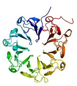 UVR8 is a β-propeller protein with 7 blade-shaped β-sheets. It shares sequence homology with mammalian proteins involved in regulating chromatin condensation, for example the human RCC1 gene product. In the dark state, UVR8 forms a homodimer that is localized in the cytosol, but UV-B illumination induces the dissociation of UVR8 dimer to its respective monomers and translocation to the nucleus occurs.[6] The dimer is held together via a complex salt bridge network.[2]
