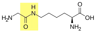 Glycine and lysine linked by an isopeptide bond. The isopeptide bond is highlighted yellow. - Ligation: E3 ubiquitin ligases catalyse the final step of the ubiquitylation cascade. Most commonly, they create an isopeptide bond between a lysine of the target protein and the C-terminal glycine of ubiquitin. In general, this step requires the activity of one of the hundreds of E3s. E3 enzymes function as the substrate recognition modules of the system and are capable of interaction with both E2 and substrate. Some E3 enzymes also activate the E2 enzymes. E3 enzymes possess one of two domains: the homologous to the E6-AP carboxyl terminus (HECT) domain and the really interesting new gene (RING) domain (or the closely related U-box domain). HECT domain E3s transiently bind ubiquitin in this process (an obligate thioester intermediate is formed with the active-site cysteine of the E3), whereas RING domain E3s catalyse the direct transfer from the E2 enzyme to the substrate.[57] The anaphase-promoting complex (APC) and the SCF complex (for Skp1-Cullin-F-box protein complex) are two examples of multi-subunit E3s involved in recognition and ubiquitylation of specific target proteins for degradation by the proteasome.[58]