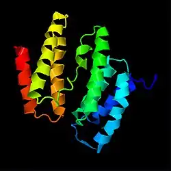 A transmembrane segment is predicted between amino acids 51 and 71 by Phobius[14] and amino acids 57 and 71 by SAPS.[12] The N-terminus is predicted to be outside of the cytoplasm, and the C-terminus within the cytoplasm.[14] The Chou–Fasman algorithm predicts a beta sheet in this region, as well as much of region between amino acids 114 and 147.[10] I-TASSER was used to predict the tertiary structure.[13] The top model predicted eight alpha helices, including one between amino acids 51 and 71 concurrent with the transmembrane segment predicted earlier, although this structure had low confidence.