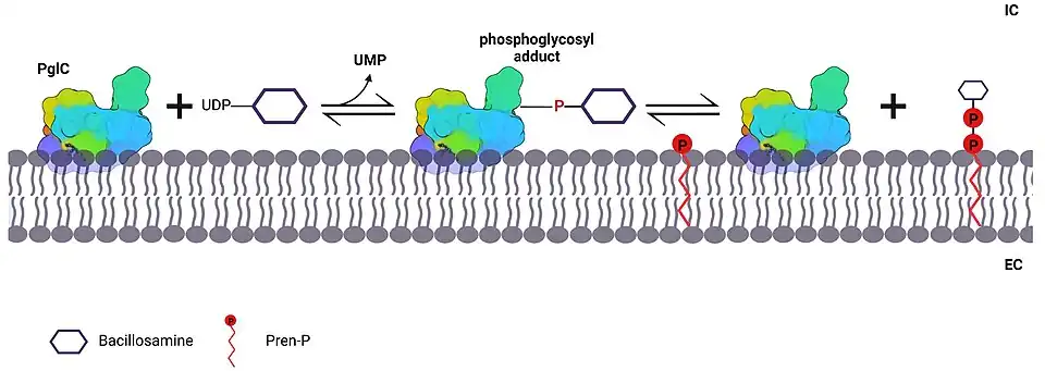 PglC is involved in the first membrane-associated catalysis step involved in the synthesis of glycoconjugates in the bacterium Campylobacter jejuni. The substrate for PglC, UDP-di-N-acetyl-bacillosamine, is first synthesized in the cytosol by the enzymes PglD, PglE, and PglF.[20] PglC is responsible for linking the sugar, di-N-acetyl-bacillosamine, to the polyprenol phosphate (pren-p) acceptor within the membrane. PglC is also unique compared to its successors in the pathway due to the attachment of a phosphosugar to pren-p. PglA, PglJ, PglH, PglI, PglK, PglB are known as glycosyltransferases and each add their own respective sugars to the growing glycan, but there is no addition of a phosphoryl group. The phosphoryl group is integral for initiation of the membrane-associated part of the pathway, otherwise no successive sugars can be added to the growing glycan.