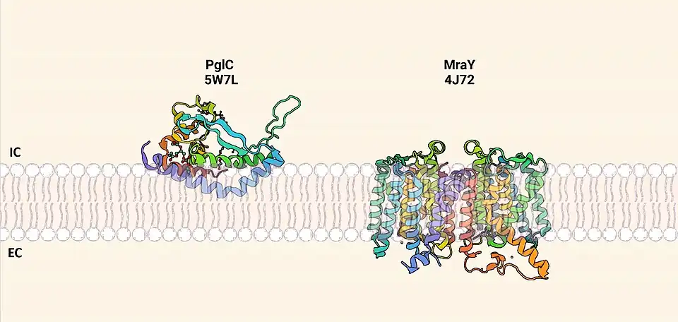 - 1 2 3 4 5 Ray LC, Das D, Entova S, Lukose V, Lynch AJ, Imperiali B, Allen KN (June 2018). "Membrane association of monotopic phosphoglycosyl transferase underpins function". Nature Chemical Biology. 14 (6): 538–541. doi:10.1038/s41589-018-0054-z. PMC 6202225. PMID 29769739.