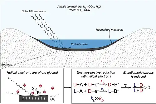 - ↑ Ozturk, S. Furkan; Sasselov, Dimitar D. (July 12, 2022). "On the origins of life's homochirality: Inducing enantiomeric excess with spin-polarized electrons". Proceedings of the National Academy of Sciences. 119 (28): e2204765119. arXiv:2203.16011. Bibcode:2022PNAS..11904765O. doi:10.1073/pnas.2204765119. ISSN 0027-8424. PMC 9282223. PMID 35787048.