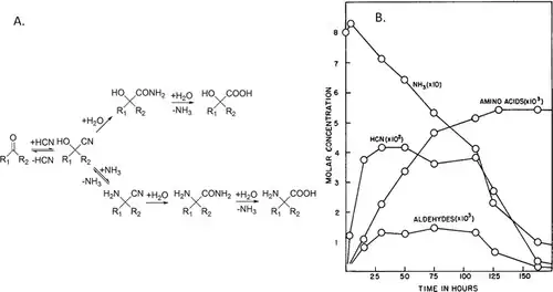 Other active intermediate compounds (acetylene, cyanoacetylene, etc.) have been detected in the aqueous solution of Miller–Urey-type experiments,[40] but the immediate HCN and aldehyde production, the production of amino acids accompanying the plateau in HCN and aldehyde concentrations, and slowing of amino acid production rate during HCN and aldehyde depletion provided strong evidence that Strecker amino acid synthesis was occurring in the aqueous solution.[29]