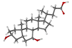 Ursodeoxycholic acid (UDCA), also known as ursodiol, is a secondary bile acid, produced in humans and most other species from metabolism by intestinal bacteria. It is synthesized in the liver in some species, and was first identified in bile of bears of genus Ursus, from which its name derived.[8] In purified form, it has been used to treat or prevent several diseases of the liver or bile ducts.