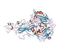 All members of this family share five highly conserved structural domains: an extracellular N-terminal ligand-binding domain with cysteine-rich repeats (also called ligand-binding repeats), an epidermal growth factor (EGF), an O-linked glycosylation sugar domain, a single transmembrane sequence, and a cytoplasmic domain which contains an NPxY sequence. The NPxY motif functions in signal transduction and the targeting of receptors to coated pits and consists of the sequence Asparagine-Proline-X-Tyrosine, where X can be any amino acid.[6] Mimicking this general structure, VLDLR has eight, 40 amino acid long cysteine-rich repeats in its extracellular N-terminal ligand-binding domain.[6] This is the main difference from the main member of the LDL receptor family, LDLR, which has only seven cysteine-rich repeats which are also 40 amino acids long.[7] Each of these cysteine-rich repeats, in both VLDLR and LDLR, has three disulfide bonds and a coordinated Ca2+ ion. The N-terminus also consists of a glycine residue followed by 27 hydrophobic residues that constitute the signal peptide.[6] Following this region is an EGF repeat, a β-propeller segment that plays a role in the pH-dependent dissociation of the ligand-receptor complex,[8] and two more EGF repeats.[9] The VLDLR O-linked glycosylation domain, next in the sequence, has many threonine and serine residues and totals 46 amino acids. The transmembrane domain, which functions in anchoring the receptors to the membrane, is 22 amino acids long.[6] Final in the sequence is the 54 amino acid cytoplasmic domain, which contains the NPxY motif.[8]