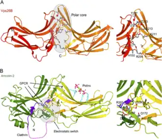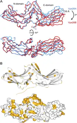 Vps26 is a 38-kDa subunit that has a two-lobed structure with a polar core that resembles the arrestin family of trafficking adaptor.[8][9] This fold consist of two related β-sandwich subdomains with a fibronectin type III domain topology. The two domains are joined by a flexible linker and are closely associated by an unusual polar core. Arrestins are regulatory proteins known for connecting G-protein coupled receptors (GPCRs) to clathrin during endocytosis. They play many critical roles in cell signalling and membrane trafficking.[10] Both Vps26 and arrestins are composed of two structurally related β-sheet domains forming extensive interfaces with each other, using polar and electrostatic contacts to create interdomain interactions for ligand binding. However, there are significant structural differences between both Vps26 and arrestins. Vps26 protein has extended C-terminal tails that do not contain identifiable clathrin- or AP2-binding sequences, and therefore cannot form stable intramolecular contacts with clathrin and AP2, which has been observed for arrestins. Moreover, Vps26 does not have similar sequences as arrestins for GPCR and phospholipid interactions.[11]