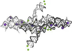 - ↑ Hoffmann, B; Mitchell, GT; Gendron, P; Major, F; Andersen, AA; Collins, RA; Legault, P (June 10, 2003). "NMR structure of the active conformation of the Varkud satellite ribozyme cleavage site". Proceedings of the National Academy of Sciences of the United States of America. 100 (12): 7003–7008. Bibcode:2003PNAS..100.7003H. doi:10.1073/pnas.0832440100. PMC 165820. PMID 12782785.