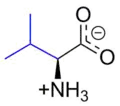 Valine (symbol Val or V)[4] is an α-amino acid that is used in the biosynthesis of proteins. It contains an α-amino group (which is in the protonated −NH3+ form under biological conditions), an α-carboxylic acid group (which is in the deprotonated −COO− form under biological conditions), and a side chain isopropyl group, making it a non-polar aliphatic amino acid. Valine is essential in humans, meaning the body cannot synthesize it; it must be obtained from dietary sources which are foods that contain proteins, such as meats, dairy products, soy products, beans and legumes. It is encoded by all codons starting with GU (GUU, GUC, GUA, and GUG).