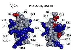 Vejocalcin shows an arrangement of charged residues, in which most of the positively charged residues are segregated on one side of the molecule, whereas neutral and negatively charged residues are clustered on the opposite side.[1] This arrangement generates a discrete dipole moment (DM) and appears to be a prevalent feature across all toxins of the calcin family.[4] Interestingly, vejocalcin has the smallest charge segregation among peptides in the calcin family. However, comparisons among different calcins show that, for each peptide, there appears to be no correlation between DM, binding affinity and subconductance state attributes.[1][5]