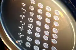 "Frogging" is a type of viability assay method that utilizes an agar plate for its environment and consists of plating serial dilutions by pinning them after they have been diluted in liquid. Some of its limitations include that it does not account for total viability and it is not particularly sensitive to low-viability assays; however, it is known for its quick pace.[1] "Tadpoling", which is a method practiced after the development of "frogging", is similar to the "frogging" method, but its test cells are diluted in liquid and then kept in liquid through the examination process. The "tadpoling" method can be used to measure culture viability accurately, which is what depicts its main separation from "frogging".[1]