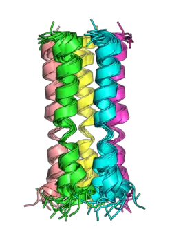 - ↑ Thomaston JL, Alfonso-Prieto M, Woldeyes RA, Fraser JS, Klein ML, Fiorin G, DeGrado WF (November 2015). "High-resolution structures of the M2 channel from influenza A virus reveal dynamic pathways for proton stabilization and transduction". Proceedings of the National Academy of Sciences of the United States of America. 112 (46): 14260–5. Bibcode:2015PNAS..11214260T. doi:10.1073/pnas.1518493112. PMC 4655559. PMID 26578770.