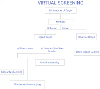 There are two broad categories of screening techniques: ligand-based and structure-based.[7] The remainder of this page will reflect Figure 1, the flow chart of virtual screening.