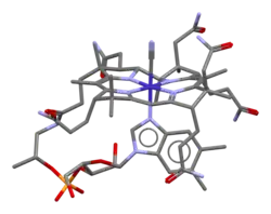 ![]() Stick model of cyanocobalamin (R = CN) based on the crystal structure[1] | |