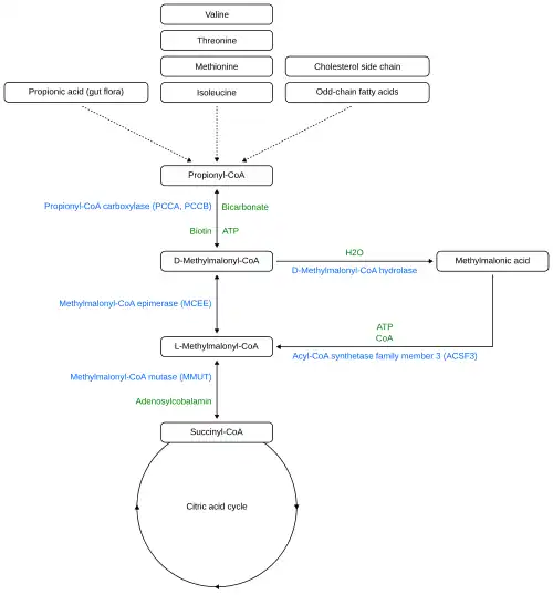 - ↑ Ballhausen D, Mittaz L, Boulat O, Bonafé L, Braissant O (December 2009). "Evidence for catabolic pathway of propionate metabolism in CNS: expression pattern of methylmalonyl-CoA mutase and propionyl-CoA carboxylase alpha-subunit in developing and adult rat brain". Neuroscience. 164 (2): 578–587. doi:10.1016/j.neuroscience.2009.08.028. PMID 19699272. S2CID 34612963.