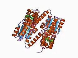 - ↑ Hanukoglu I (2015). "Proteopedia: Rossmann fold: A beta-alpha-beta fold at dinucleotide binding sites". Biochem Mol Biol Educ. 43 (3): 206–209. doi:10.1002/bmb.20849. PMID 25704928. S2CID 11857160.