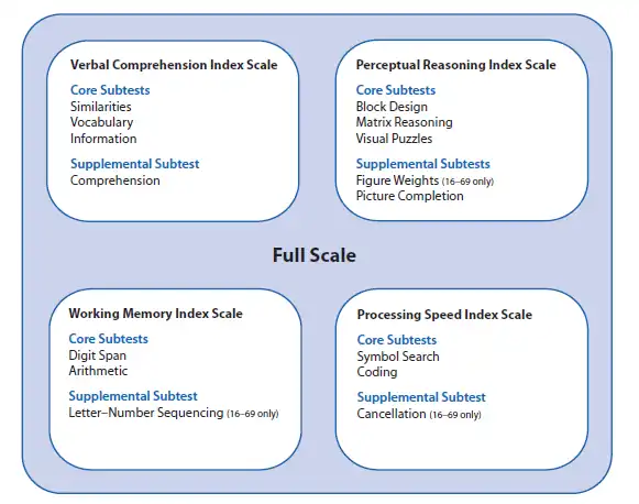 The Full Scale Intelligence Quotient is now generated from only seven subtests (Similarities, Vocabulary, Block Design, Matrix Reasoning, Figure Weights, Digit Span Sequencing, Coding), similar to the WISC-V. Fifteen ancillary index scores, including the General Ability Index, are also present.