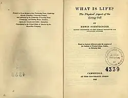 What Is Life? The Physical Aspect of the Living Cell is a 1944 science book written for the lay reader by the physicist Erwin Schrödinger. The book was based on a course of public lectures delivered by Schrödinger in February 1943, under the auspices of the Dublin Institute for Advanced Studies, where he was Director of Theoretical Physics, at Trinity College, Dublin. The lectures attracted an audience of about 400, who were warned "that the subject-matter was a difficult one and that the lectures could not be termed popular, even though the physicist’s most dreaded weapon, mathematical deduction, would hardly be utilized."[1] Schrödinger's lecture focused on one important question: "how can the events in space and time which take place within the spatial boundary of a living organism be accounted for by physics and chemistry?"[1]