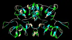Wheat germ agglutinin (WGA) is a lectin that protects wheat (Triticum) from insects, yeast and bacteria. An agglutinin protein, it binds to N-acetyl-D-glucosamine and sialic acid.[1] WGA has also been shown to interact with sialic acid residues on oligosaccharides.[2] Succinylated WGA is selective for β-N-acetylglucosamine (β-GlcNAc), making it a useful tool for detecting O-GlcNAc. WGA is composed of a mixture of three isoforms (WGA1, WGA2, WGA3), which are quite similar to each other and each contain an unusually high amount of glycine.[3][4] These three isoforms vary at a total of 10 amino acid positions and all have dimeric structures with four domains per monomer.[3] Each domain (WGA.A, WGA.B, WGA.C, WGA.D) is hevein-like and is stabilized by a disulfide bond.[5] N-acetyl-D-glucosamine in the natural environment of wheat is found in the chitin of insects, and the cell membrane of yeast & bacteria. WGA is found abundantly—but not exclusively—in the wheat kernel, where it got the 'germ' name from. In mammals the N-acetyl-D-glucosamine that WGA binds to is found in cartilage[6] and cornea[7] among other places. In those animals sialic acid is found in mucous membranes, e.g. the lining of the inner nose, and digestive tract.