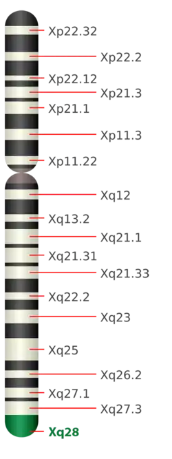 Xq28 is a chromosome band and genetic marker situated at the tip of the X chromosome which has been studied since at least 1980.[1] The band contains three distinct regions, totaling about 8 Mbp of genetic information.[2] The marker came to the public eye in 1993 when studies by Dean Hamer and others indicated a link between the Xq28 marker and male sexual orientation.[3]
