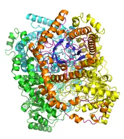In enzymology, a xylose isomerase (EC 5.3.1.5) is an enzyme that catalyzes the interconversion of D-xylose and D-xylulose. This enzyme belongs to the family of isomerases, specifically those intramolecular oxidoreductases interconverting aldoses and ketoses. The isomerase has now been observed in nearly a hundred species of bacteria.[2] Xylose-isomerases are also commonly called glucose isomerase or fructose isomerases due to their ability to interconvert glucose and fructose. The systematic name of this enzyme class is α-D-xylopyranose aldose-ketose-isomerase. Other names in common use include D-xylose isomerase, D-xylose ketoisomerase, and D-xylose ketol-isomerase.[3]
