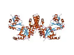 - ↑ Teplyakov A, Obmolova G, Chu SY, Toedt J, Eisenstein E, Howard AJ, Gilliland GL (July 2003). "Crystal structure of the YchF protein reveals binding sites for GTP and nucleic acid". J. Bacteriol. 185 (14): 4031–7. doi:10.1128/jb.185.14.4031-4037.2003. PMC 164861. PMID 12837776.