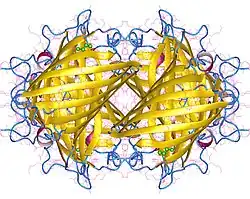 Yellow fluorescent protein (YFP) is a genetic mutant of green fluorescent protein (GFP) originally derived from the jellyfish Aequorea victoria.[1] Its excitation peak is 513 nm and its emission peak is 527 nm.[2] Like the parent GFP, YFP is a useful tool in cell and molecular biology because the excitation and emission peaks of YFP are distinguishable from GFP which allows for the study of multiple processes/proteins within the same experiment.