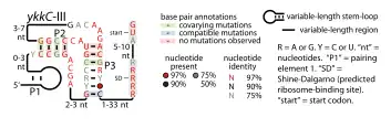 The ykkC-III RNA motif[8] is a distinct candidate cis-regulatory RNA that appears to regulate genes related to the preceding motifs. Although the structure of ykkC-III RNAs does not resemble ykkC/yxkD RNAs, both have a structure complexity that led to the proposal that they represent riboswitches. The ykkC-III motif has a rigidly conserved ACGA sequence within it that resembles a less rigidly conserved ACGA or ACGG sequence found in mini-ykkC RNAs, but it is unknown whether this observation relates to a biological relationship. Biochemical validation has been presented to show that this motif is a third class of guanidine riboswitches called Guanidine-III riboswitch.[9]