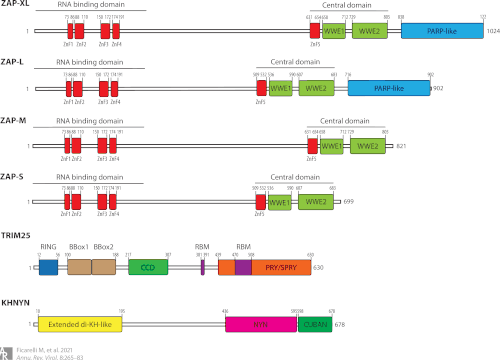 Multiple ZAP cofactors have been reported to be required for antiviral activity. However the E3 ubiquitin ligase TRIM25 (tripartite motif protein 25) and KHNYN (KH-like and NYN domain-containing protein) have the most well documented evidence.[14][15][16] TRIM25 has been shown to promote ZAP activity by multimerization through its RING domain whereas KHNYN acts an active nuclease for RNA cleavage which can be partially replaced functionally by its homolog N4BP1.[17]