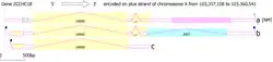 Including 5’-UTR and 3’-UTR, ZCCHC18 spans from chrX:104,112,526-104,115,846 with a total of 3,321 base pairs (bps) (5’-UTR: 1206 bps and 3’-UTR: 523 bps). It contains 3 exons and 2 distinct gt-ag introns, being transcribed into 3 alternatively spliced mRNAs. However, only one spliced mRNA (NM_001143978.2, 2951 bps) putatively encodes a protein with 403 amino acids (coding region: hg38 chrX:104,114,112-104,115,323, total 1,212 bps), whereas others do not encode proteins.[6][15][16]