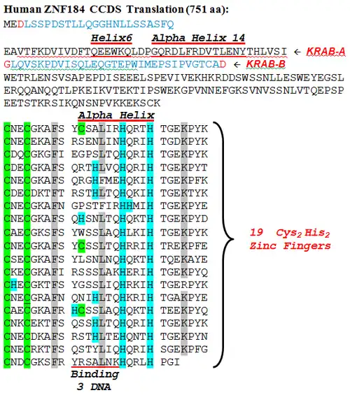 Near the N-terminus is a KRAB_A domain followed by a KRAB_B domain. KRAB_A has a shorter α-Helix followed by a longer α-Helix. The KRAB_A motif in a zinc finger protein is known to bind with a KAP-1 protein (aka TRIM28) to accomplish a transcription repressor function, however a gene so regulated by ZNF184 has yet to be identified. The length-11 finger helices are indicated, as well as the overlapping 7-residue section in each finger which binds targeted DNA (if the finger is functioning).