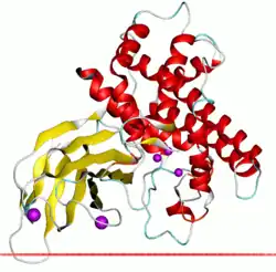 ![]() Alpha toxin of Clostridium showing the zinc dependent phospholipase domain in red and the PLAT domain in yellow | |||||||||