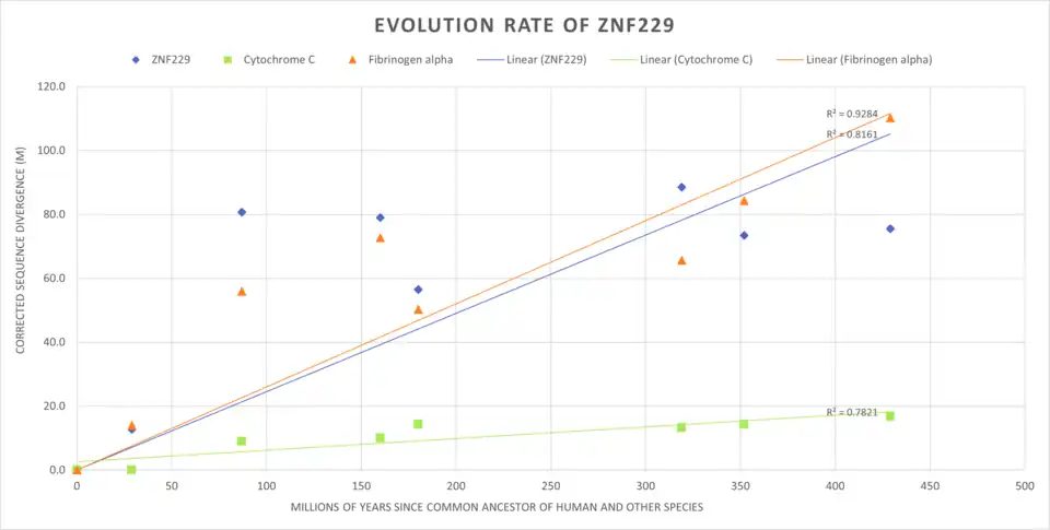 There are orthologs of the ZNF229 human gene found in nearly all life forms. Some ortholog groups include mammals (identity of 45%), reptiles (42-46%), birds (52-56%), fish (47-54%), invertebrates (39-54%), fungi (46-55%), plants (31-39%), and bacteria (34-51%). ZNF229 did not have any significant orthologs in archaea.[16][17]