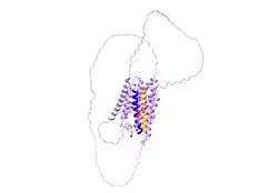 Zinc transporter SLC39A7 (ZIP7), also known as solute carrier family 39 member 7, is a transmembrane protein that in humans is encoded by the SLC39A7 gene.[5][6][7][8][9][10][11] It belongs to the ZIP family, which consists of 14 proteins that transport zinc into the cytoplasm.[8][9][10][11] Its primary role is to control the transport of zinc from the ER and Golgi apparatus to the cytoplasm.[8][9][10][11] It also plays a role in glucose metabolism.[8][10][12] Its structure consists of helices that bind to zinc in a binuclear metal center.[9][10] Its fruit fly orthologue is Catsup.