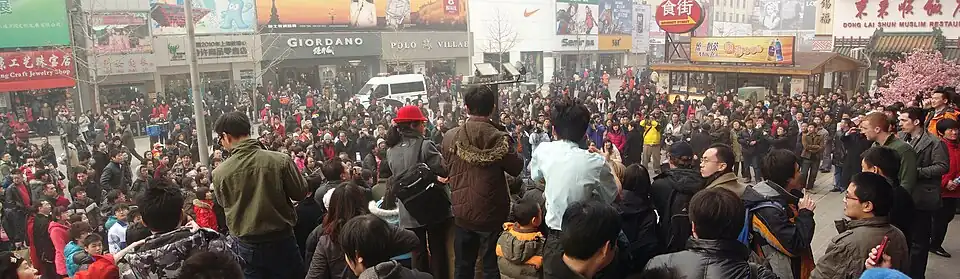 ![]() A large crowd of protesters, journalists, police and spectators gathered in front of a McDonald's restaurant in Wangfujing, Beijing. | |||