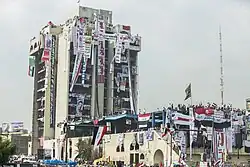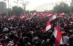 Fueled by the lack of progress of Haider al-Abadi's government and state corruption, the leader of the Sadrist Movement, Muqtada al-Sadr, called for a sit-in within the Green Zone in Baghdad to force the government to find serious solutions for corruption.[33] On 30 April 2016, thousands of Al-Sadr's followers breached the barricades of the Green Zone and stormed into governmental buildings, including the Iraqi parliament,[34] chasing representatives out of the Green Zone before retreating the day after by the call of Al-Sadr.[35] Another demonstration broke out in Basra and nearby cities in July 2018 due to deteriorating public utilities, water contamination and lack of electricity and continued for a few months.[36][37] Protestors burned down a number of government buildings and parties' headquarters, blocked numerous main streets, tore and burned pictures of Khomeini and Khamenei and even occupied the Al-Najaf and Basra International Airports.[38][39] They were faced with live bullets from security forces causing the death of at least 16 protestors.[40][41][39]