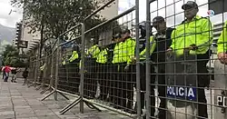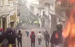 Indigenous peoples' groups began protests shortly thereafter, along with university students and labour unions.[41] The protesters declared their intention to hold an indefinite general strike, which would last until the government overturned its decision.[48] Moreno refused to discuss a potential reversal, saying that he would "not negotiate with criminals",[49] sparking clashes between the National Police and protesters, who were attempting to break into the Carondelet Palace in Quito.[50] The Armed Forces were deployed by the government on 7 October to force protesters to release over 50 servicemen, who were being held captive by protesting indigenous groups.[51]