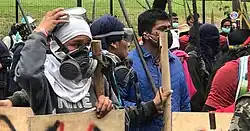 While initially peaceful, violence erupted after the demonstrators were met by police, who attempted to disperse them using tear gas. Demonstrators responded by throwing stones, molotov cocktails and tube-launched fireworks at the mounted riot police officers sent to disperse them.[60][4] The Energy Ministry reported that the country's main oil pipeline had ceased operating after being seized by indigenous protesters.[61]