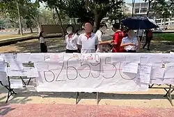 The implementation of the Thai lèse majesté law has been controversial since Bhumibol's reign. The number of cases peaked to an unprecedented scale after 2014 coup.[70] Critics viewed it as a political weapon to suppress dissent and restrict freedom of speech. Even though there have been no new cases since 2018, as Prayut said was the wish of King Vajiralongkorn, other security laws had been invoked in its place, such as the sedition law, the Computer Crime Act, or the offense of being a member of an organized crime group (อั้งยี่), all of which incur comparably severe punishment, and has been using this law as a political manipulation tool.[71] In June 2020, the forced disappearance of Wanchalearm Satsaksit, assumed to be related to accusations of lèse majesté, gained online attention and sympathy.[72] In July 2020, Tiwagorn Withiton, who wore a shirt with the slogan "I lost faith in the monarchy", was subjected to political psychiatry.[73]