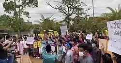 The first wave protests were triggered by the Constitution Court decision to disband the FFP on 23 February 2020.[87] Demonstrations since erupted in various high schools, colleges, and universities nationwide. These student-organised protests also came with various hashtags unique to their institutions. The firsts began at Thammasat University, Chulalongkorn University, Ramkhamhaeng University, Kasetsart University, Srinakharinwirot University and Prince of Songkhla University on 24 February. Various high school students also organised protests at Triam Udom Suksa School and Suksanari School.