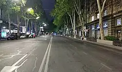 An estimated 50,000 protesters gathered and marched through the central Tbilisi prior to the beginning of third hearing of the bill, on 11 May.[146][147][148] Protesters marched to the capital's Europe Square holding Georgian and European flags, chanting "no to the Russian law".[149] The same day seven opposition parties — Ahali, United National Movement, Lelo, Girchi – More Freedom, Droa and Strategy Builder — issued a joint statement, saying that the bill would be unacceptable no matter how much revised, calling the parliamentary majority to scrap the bill altogether.[150] On 12 May, Protesters said that they would stay overnight as third hearing of the bill in the Legal Affair Committee was scheduled for the next day. The road leading to the Parliament building through the Rustaveli Avenue was blocked.[151]