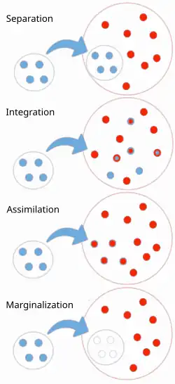 The fourfold models used to describe individual attitudes of immigrants parallel models used to describe group expectations of the larger society and how groups should acculturate.[27] In a melting pot society, in which a harmonious and homogenous culture is promoted, assimilation is the endorsed acculturation strategy. In segregationist societies, in which humans are separated into racial, ethnic and/or religious groups in daily life, a separation acculturation strategy is endorsed. In a multiculturalist society, in which multiple cultures are accepted and appreciated, individuals are encouraged to adopt an integrationist approach to acculturation. In societies where cultural exclusion is promoted, individuals often adopt marginalization strategies of acculturation.