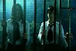 The bridge section has the girls lying in water while snow starts to fall. At the last portion of the chorus, t.A.T.u. are portrayed pointing in different directions, until they both walk around corner and see a vast field, where the sun is breaking out of the clouds; they clasp hands and walk off into the distance. The people on the other side of the fence are left in an eerie green light with rain falling steadily; it is also revealed that they are the ones isolated behind the fence. The video's final scene shows the girls walking further in the distance.[63] Several frames from "Ya Soshla s Uma" did not appear in the visual for "All the Things She Said" due to lip-syncing problems.[64]