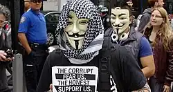 When the Occupy Wall Street protests began in New York City in September 2011, Anons were early participants and helped spread the movement to other cities such as Boston.[19] In October, some Anons attacked the website of the New York Stock Exchange while other Anons publicly opposed the action via Twitter.[53] Some Anons also helped organize an Occupy protest outside the London Stock Exchange on May 1, 2012.[139]