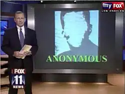 Users of 4chan's /b/ board would occasionally join into mass pranks or raids.[66] In a raid on July 12, 2006, for example, large numbers of 4chan readers invaded the Finnish social networking site Habbo Hotel with identical avatars; the avatars blocked regular Habbo members from accessing the digital hotel's pool, stating it was "closed due to fail and AIDS".[69] Future LulzSec member Topiary became involved with the site at this time, inviting large audiences to listen to his prank phone calls via Skype.[70][a] Due to the growing traffic on 4chan's board, users soon began to plot pranks off-site using Internet Relay Chat (IRC).[72] These raids resulted in the first mainstream press story on Anonymous, a report by Fox station KTTV in Los Angeles, California in the U.S. The report called the group "hackers on steroids", "domestic terrorists", and an "Internet hate machine".[65][73]