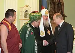 Vladimir Putin has promoted explicitly conservative policies in social, cultural and political matters, both at home and abroad. Putin has attacked globalism and neoliberalism[41] and promoted new think tanks that stress Russian nationalism, the restoration of Russia's historical greatness, and systematic opposition to liberal ideas and policies.[42] Putin has collaborated closely with the Russian Orthodox Church in this cultural campaign. Patriarch Kirill of Moscow, head of the Church, endorsed his election in 2012, stating Putin's terms were like "a miracle of God."[43][44] The Russian Orthodox Church is known to host groups that promote nationalist and anti-Western tendencies.[45][46]
