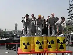 The anti-nuclear movement is a social movement that opposes various nuclear technologies. Some direct action groups, environmental movements, and professional organisations have identified themselves with the movement at the local, national, or international level.[2][3] Major anti-nuclear groups include Campaign for Nuclear Disarmament, Friends of the Earth, Greenpeace, International Physicians for the Prevention of Nuclear War, Peace Action, Seneca Women's Encampment for a Future of Peace and Justice and the Nuclear Information and Resource Service. The initial objective of the movement was nuclear disarmament, though since the late 1960s opposition has included the use of nuclear power. Many anti-nuclear groups oppose both nuclear power and nuclear weapons. The formation of green parties in the 1970s and 1980s was often a direct result of anti-nuclear politics.[4]