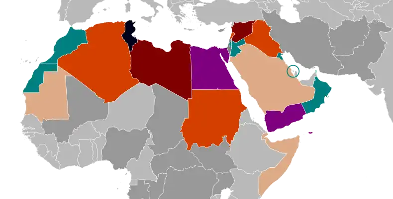 The Arab Spring (Arabic: الربيع العربي, romanized: ar-rabīʻ al-ʻarabī) was a series of anti-government protests, uprisings, and armed rebellions that spread across much of the Arab world in the early 2010s. It began in Tunisia in response to corruption and economic stagnation.[1][2] From Tunisia, the protests initially spread to five other countries: Libya, Egypt, Yemen, Syria and Bahrain. Rulers were deposed (Zine El Abidine Ben Ali of Tunisia, Muammar Gaddafi of Libya, and Hosni Mubarak of Egypt all in 2011, and Ali Abdullah Saleh of Yemen in 2012) and major uprisings and social violence occurred, including riots, civil wars, or insurgencies. Sustained street demonstrations took place in Morocco, Iraq, Algeria, Lebanon, Jordan, Kuwait, Oman and Sudan. Minor protests took place in Djibouti, Mauritania, Palestine, Saudi Arabia and the Western Sahara.[3] A major slogan of the demonstrators in the Arab world is ash-shaʻb yurīd isqāṭ an-niẓām! (Arabic: الشعب يريد إسقاط النظام, lit.'the people want to bring down the regime').[4]
