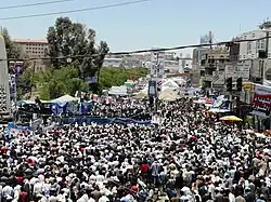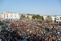 The series of protests and demonstrations across the Middle East and North Africa that commenced in 2010 became known as the "Arab Spring",[76][77][78] and sometimes as the "Arab Spring and Winter",[79] "Arab Awakening",[80][81] or "Arab Uprisings",[82][83] even though not all the participants in the protests were Arab. It was sparked by the first protests that occurred in Tunisia on 18 December 2010 in Sidi Bouzid, following Mohamed Bouazizi's self-immolation in protest of police corruption and ill treatment.[84][85] With the success of the protests in Tunisia, a wave of unrest sparked by the Tunisian "Burning Man" struck Algeria, Jordan, Egypt, and Yemen,[86] then spread to other countries. The largest, most organized demonstrations often occurred on a "day of rage", usually Friday afternoon prayers.[87][88][89] The protests also triggered similar unrest outside the region. Contrary to expectations the revolutions were not led by Islamists: