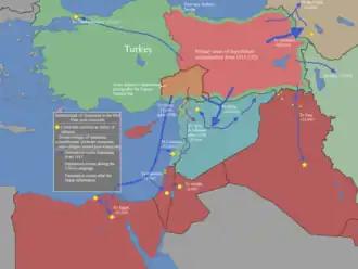 The Armenian diaspora grew considerably both during and after the First World War due to the dissolution of the Ottoman Empire.[19] In the year 1910, over 5,500 Armenians immigrated to the United States, and by 1913, 9,355 more Armenians entered the North American borders.[18] As World War I approached, the rate of Armenian immigration rose to about 60,000. In 1920 and until the Immigration Act of 1924, 30,771 Armenians came to the United States; the immigrants were predominantly widowed women, children, and orphans.[18] Although many Armenians perished during the Armenian genocide, some of the Armenians who managed to escape, established themselves in various parts of the world.