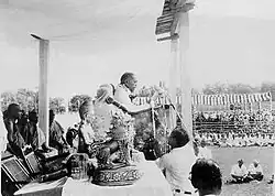 After meetings with the Sri Lankan Buddhist monk Hammalawa Saddhatissa,[100] Ambedkar organised a formal public ceremony for himself and his supporters in Nagpur on 14 October 1956. Accepting the Three Refuges and Five Precepts from a Buddhist monk in the traditional manner, Ambedkar completed his own conversion, along with his wife. He then proceeded to convert some 500,000 of his supporters who were gathered around him.[97][101] He prescribed the 22 Vows for these converts, after the Three Jewels and Five Precepts. He then travelled to Kathmandu, Nepal to attend the Fourth World Buddhist Conference.[98] His work on The Buddha or Karl Marx and "Revolution and counter-revolution in ancient India" remained incomplete.
